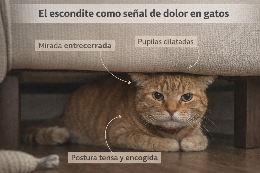 Cuando el ocultamiento es por miedo o estrés agudo, suele estar acompañado de hipervigilancia (ojos muy abiertos, pupilas dilatadas), sobresaltos ante cualquier ruido y tensión muscular visible. En estos casos, la solución es bajar los estímulos de la casa, evitar forzar el contacto y usar herramientas de apoyo como las feromonas felinas.
