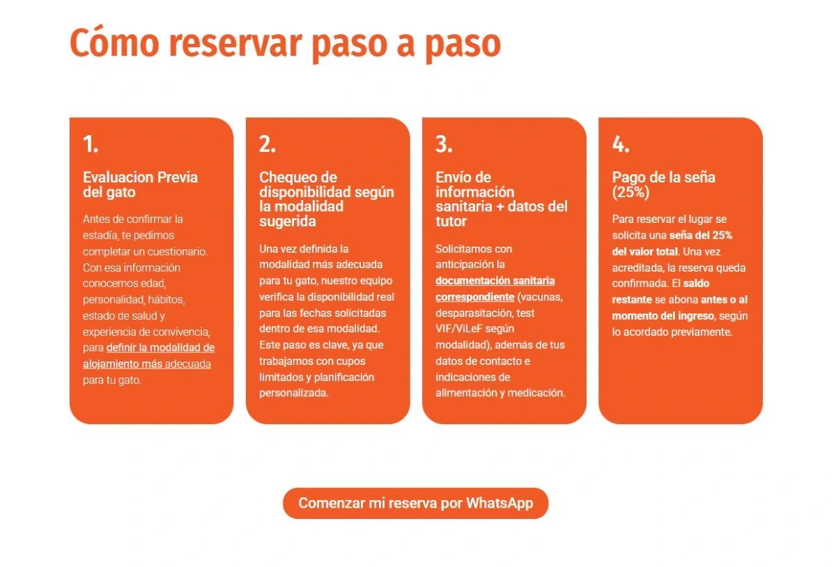 Escribinos por WhatsApp, contanos su edad, qué cambios notaste (en sus saltos, arenero o apetito) y si toma alguna medicación. En Espacio Gatos podemos orientarte con criterio médico para asegurarle una modalidad de alojamiento sin estrés, con adaptación a su movilidad y seguimiento clínico 24/7.